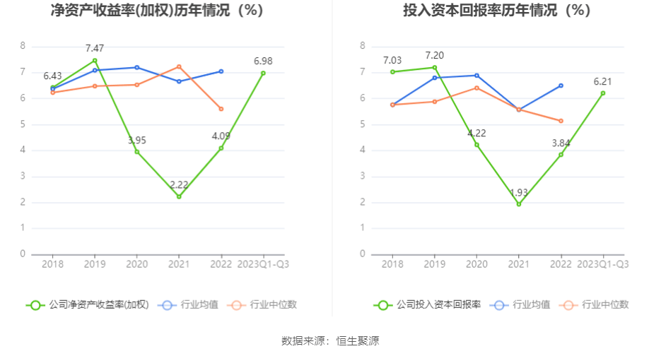 数据显示,2023年前三季度公司加权平均净资产收益率为6.98%,较上年同期增长2.03个百分点;公司2023年前三季度投入资本回报率为6.21%,较上年同期增长1.41个百分点。