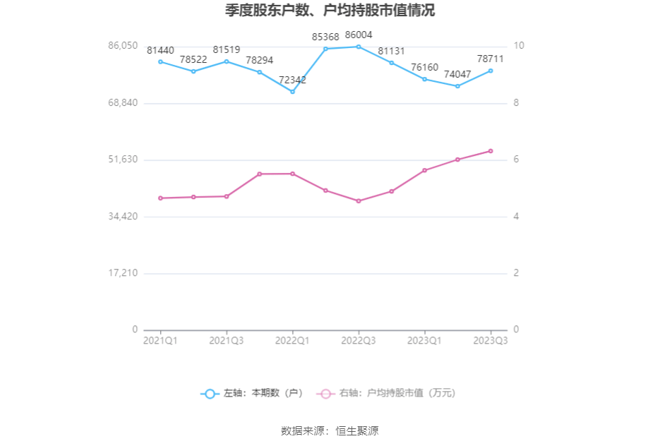 筹码集中度方面,截至2023年三季度末,公司股东总户数为7.87万户,较上半年末增长了4664户,增幅6.30%;户均持股市值由上半年末的6.02万元上升至6.32万元,增幅为4.98%。