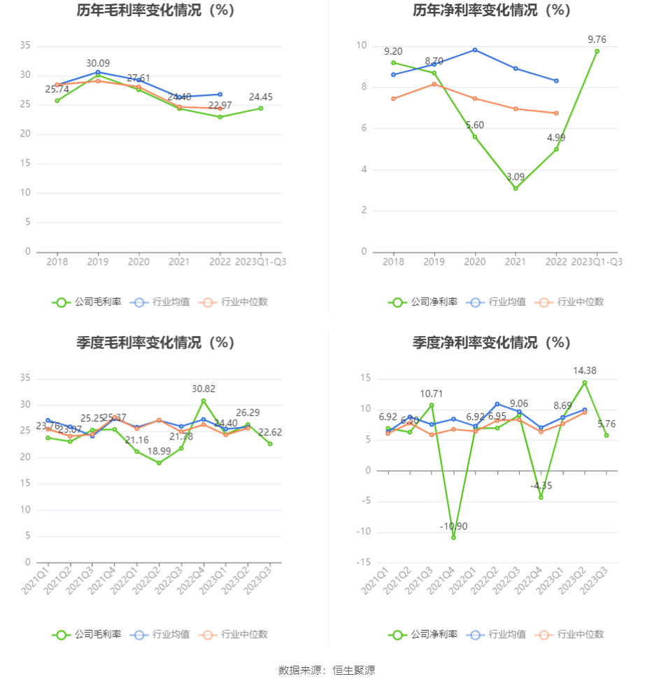 2023年前三季度,公司毛利率为24.45%,同比上升3.77个百分点;净利率为9.76%,较上年同期上升2.05个百分点。从单季度指标来看,2023年第三季度公司毛利率为22.62%,同比上升0.84个百分点,环比下降3.67个百分点;净利率为5.76%,较上年同期下降3.30个百分点,较上一季度下降8.62个百分点。