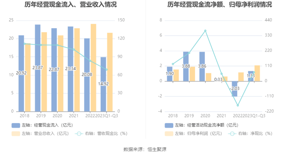 2023年前三季度,公司营业收入现金比为69.06%,净现比为64.09%。
