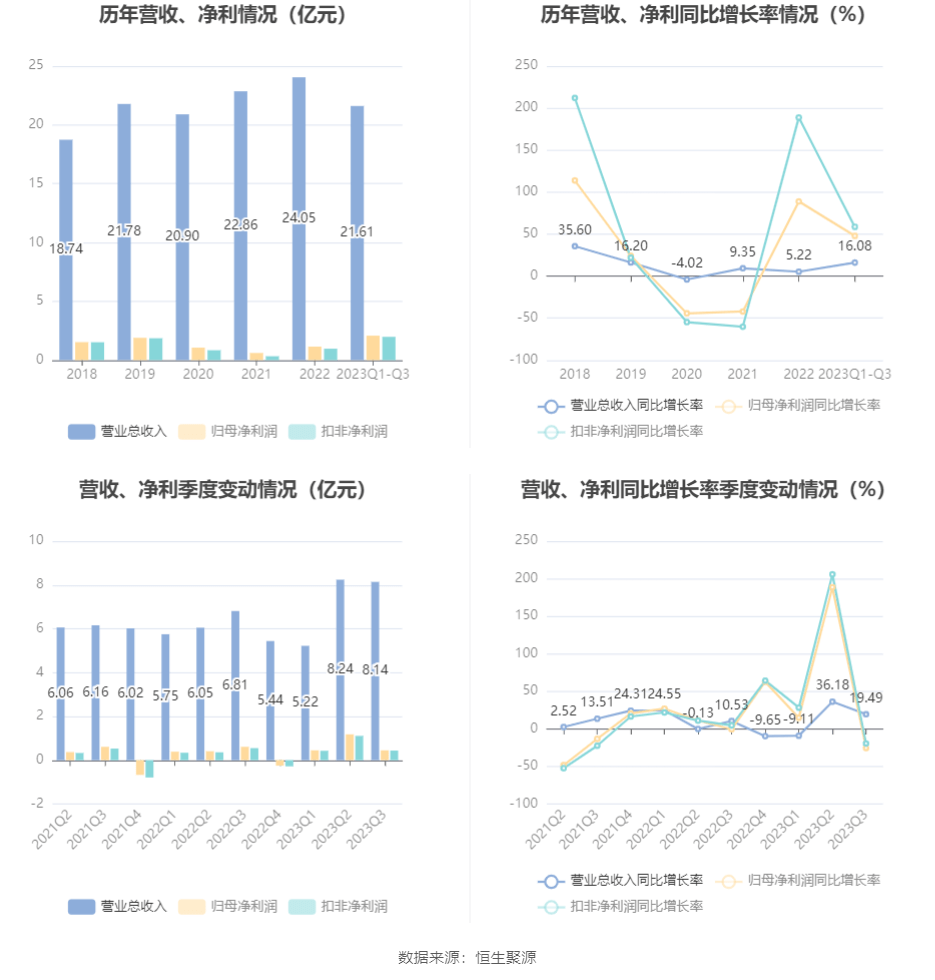 根据三季报,公司第三季度实现营业总收入8.14亿元,同比增长19.49%,环比下降1.23%;归母净利润4536.37万元,同比下降25.43%,环比下降61.42%;扣非净利润4435.51万元,同比下降19.41%,环比下降59.88%。