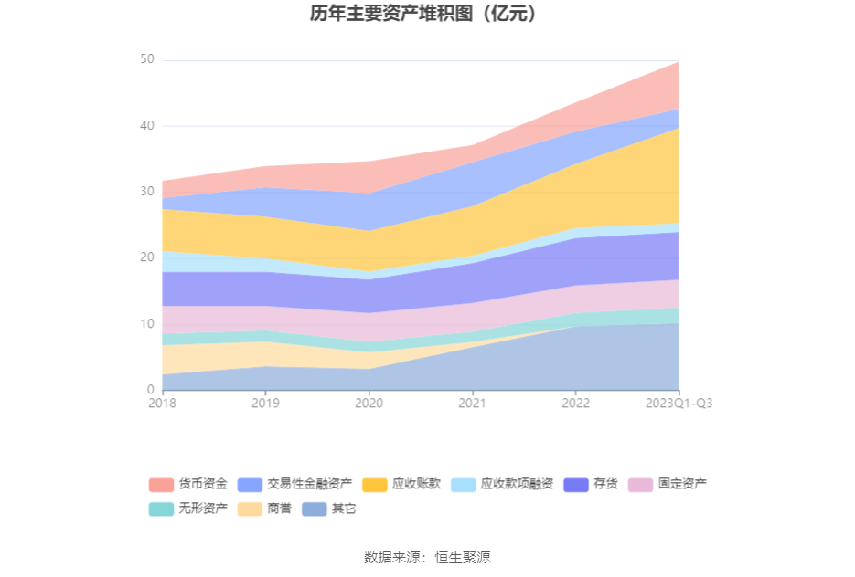 资产重大变化方面,截至2023年三季度末,公司应收账款较上年末增加48.82%,占公司总资产比重上升6.76个百分点;交易性金融资产较上年末减少41.52%,占公司总资产比重下降5.43个百分点;货币资金较上年末增加62.34%,占公司总资产比重上升4.29个百分点;在建工程较上年末增加197.20%,占公司总资产比重上升2.58个百分点。