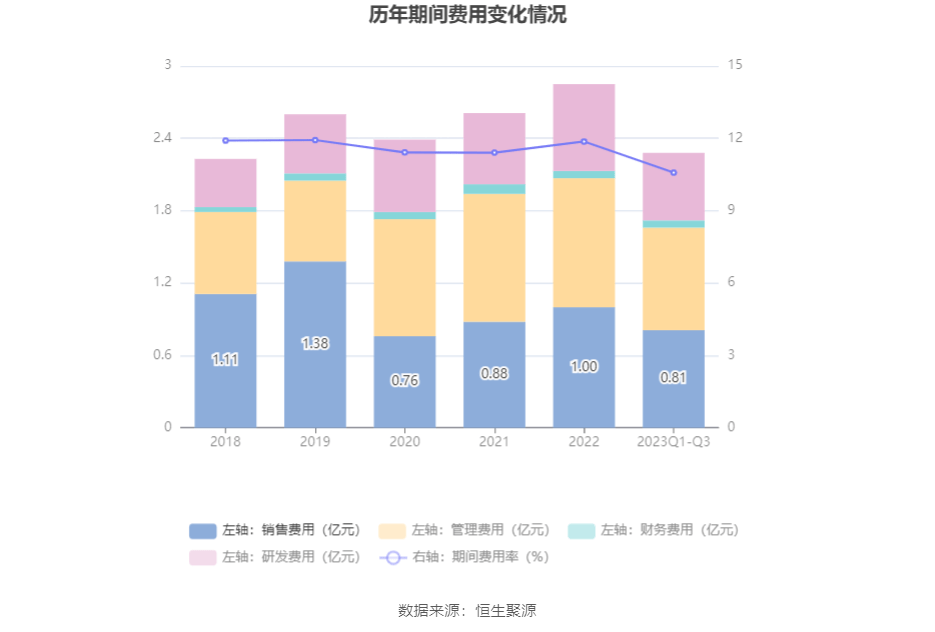 2023年前三季度,公司期间费用为2.29亿元,较上年同期增加3379.57万元;期间费用率为10.58%,较上年同期上升0.11个百分点。其中,销售费用同比增长14.97%,管理费用同比增长29.01%,研发费用同比增长7.68%,财务费用同比增长1.99%。