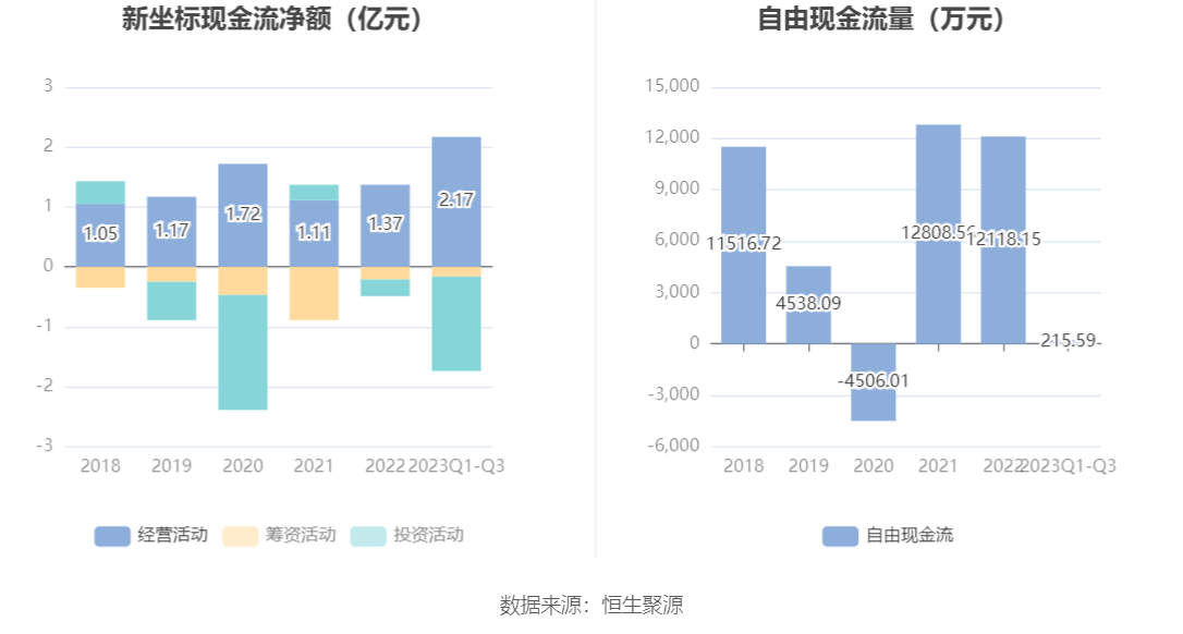 2023年前三季度,公司经营活动现金流净额为2.17亿元,同比增长173.98%,主要系报告期内因销售增长回款增加及票据到期结算增加所致;筹资活动现金流净额-1575.86万元,同比增加1883.47万元;投资活动现金流净额-1.58亿元,上年同期为-1942.64万元。