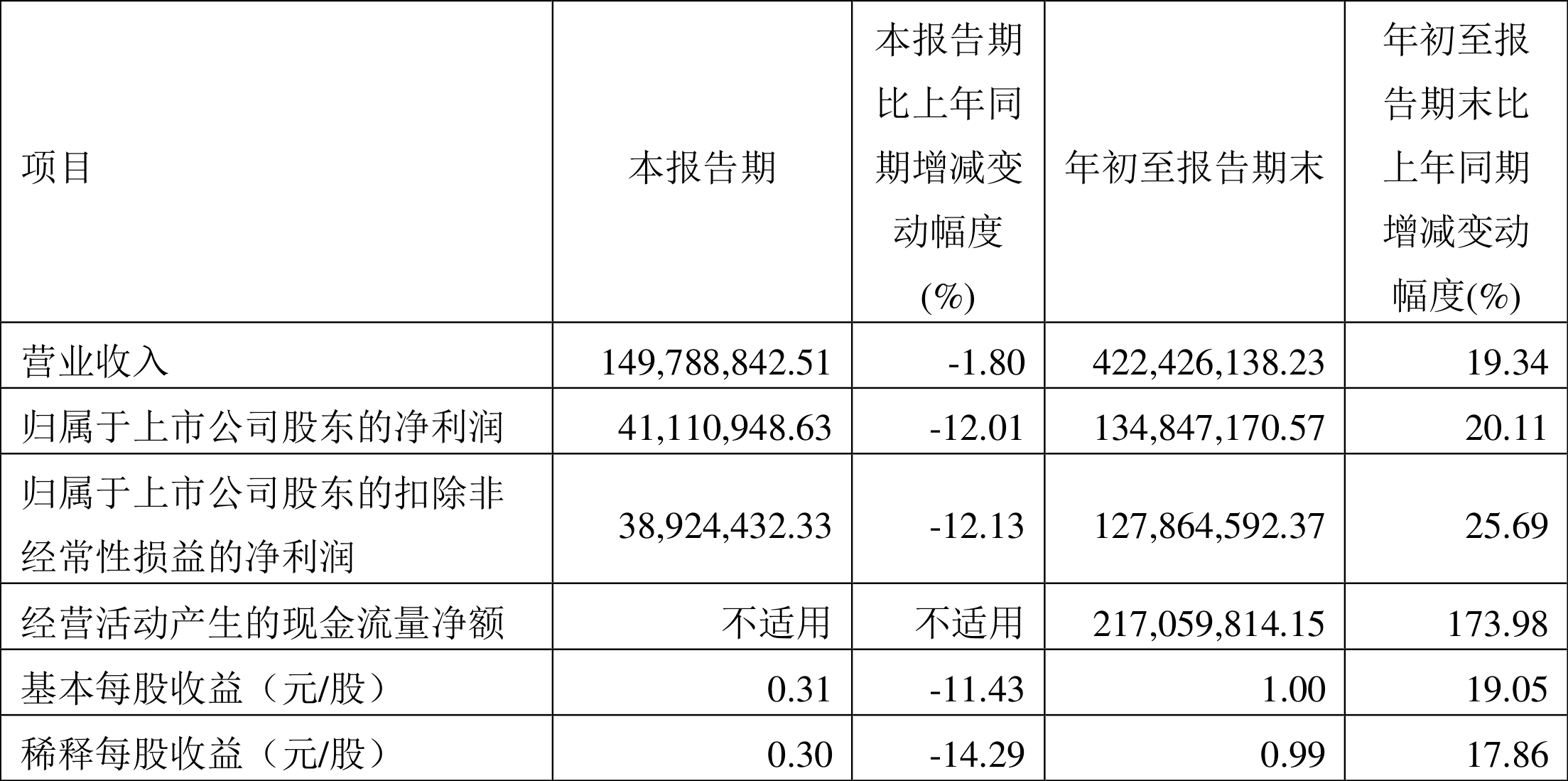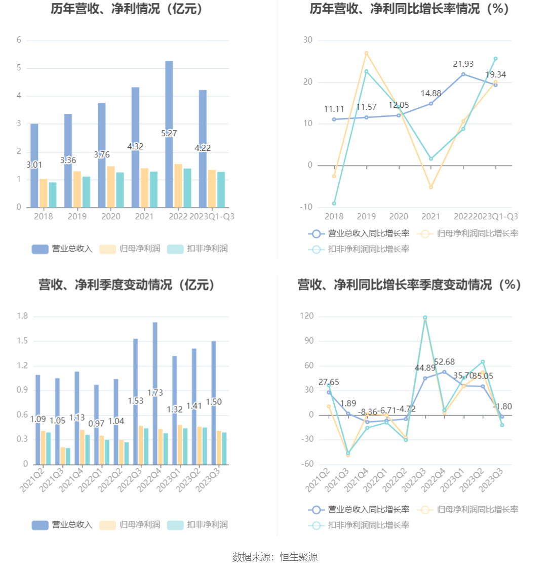 根据三季报,公司第三季度实现营业总收入1.5亿元,同比下降1.80%,环比增长6.40%;归母净利润4111.09万元,同比下降12.01%,环比下降10.16%;扣非净利润3892.44万元,同比下降12.13%,环比下降14.13%。