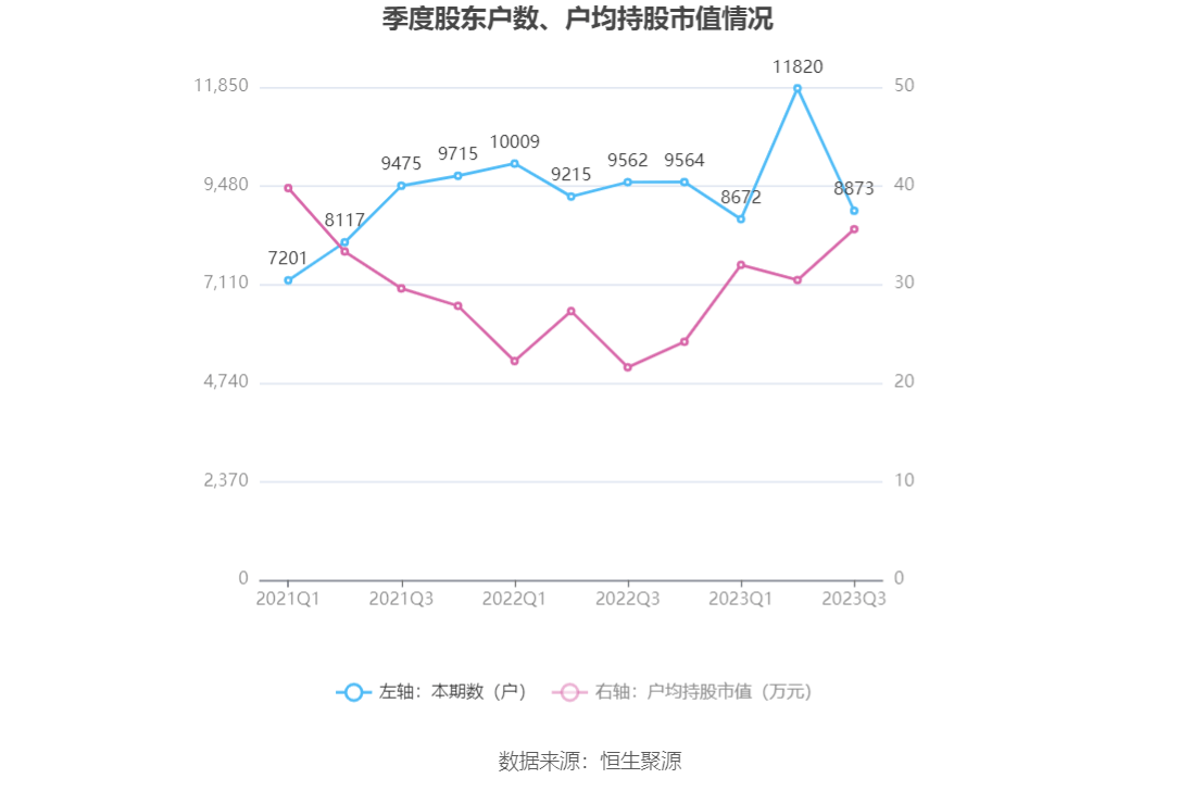 筹码集中度方面,截至2023年三季度末,公司股东总户数为8873户,较上半年末下降了2947户,降幅24.93%;户均持股市值由上半年末的30.42万元上升至35.57万元,增幅为16.93%。