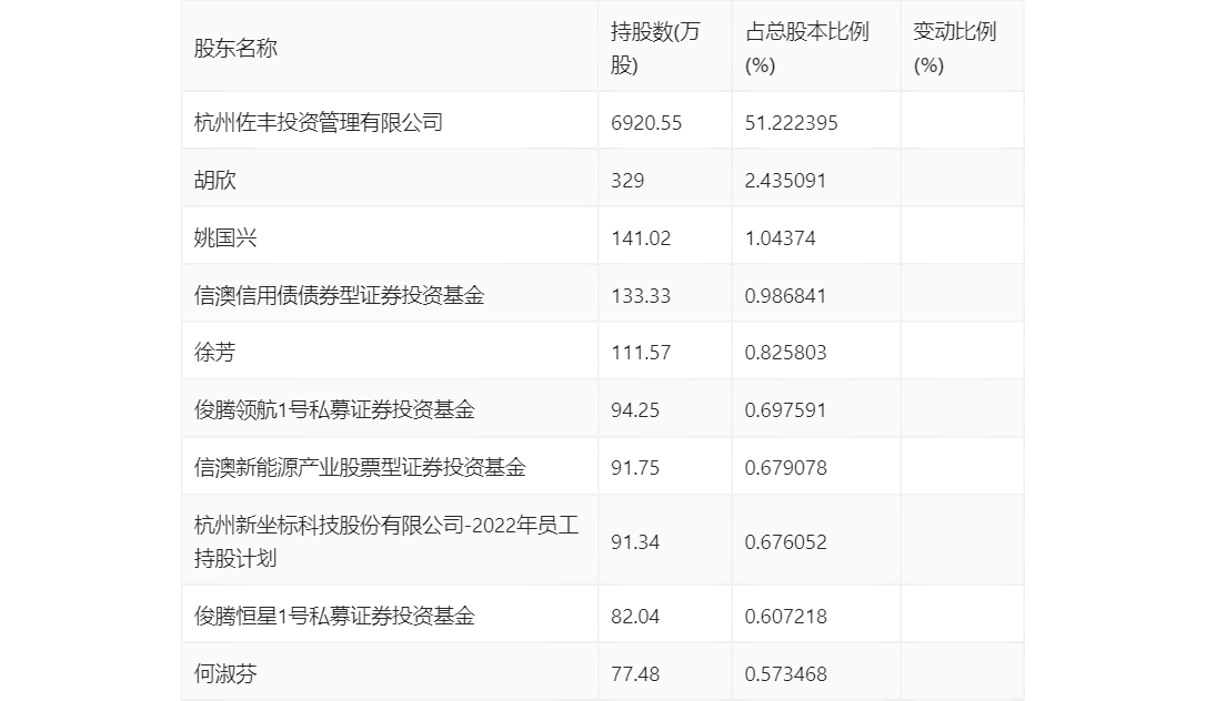 三季报显示,2023年三季度末的公司十大流通股东中,新进股东为信澳信用债债券型证券投资基金、俊腾领航1号私募证券投资基金、俊腾恒星1号私募证券投资基金,取代了二季度末的中欧时代先锋股票型发起式证券投资基金、信澳智远三年持有期混合型证券投资基金、重阳3期证券投资集合资金信托计划。在具体持股比例上,杭州佐丰投资管理有限公司、胡欣、姚国兴、徐芳、2022年员工持股计划、何淑芬持股有所上升,信澳新能源产业股票型证券投资基金持股有所下降。