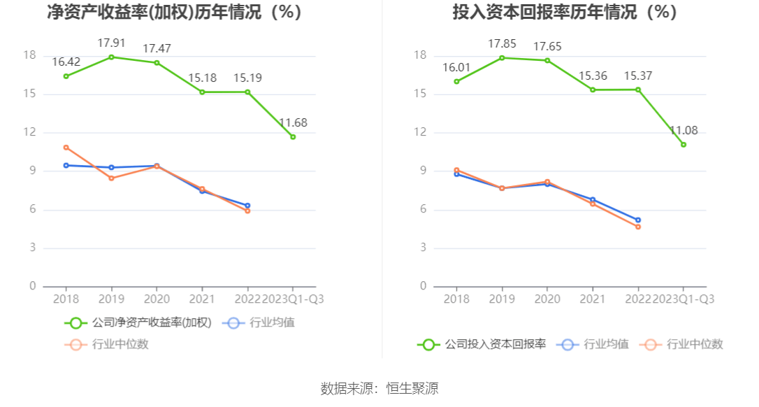 数据显示,2023年前三季度公司加权平均净资产收益率为11.68%,较上年同期增长0.50个百分点;公司2023年前三季度投入资本回报率为11.08%,较上年同期下降0.30个百分点。