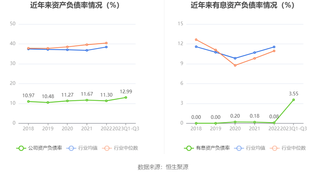 在偿债能力方面,公司2023年三季度末资产负债率为12.99%,相比上年末上升1.69个百分点;有息资产负债率为3.55%,相比上年末上升3.47个百分点。