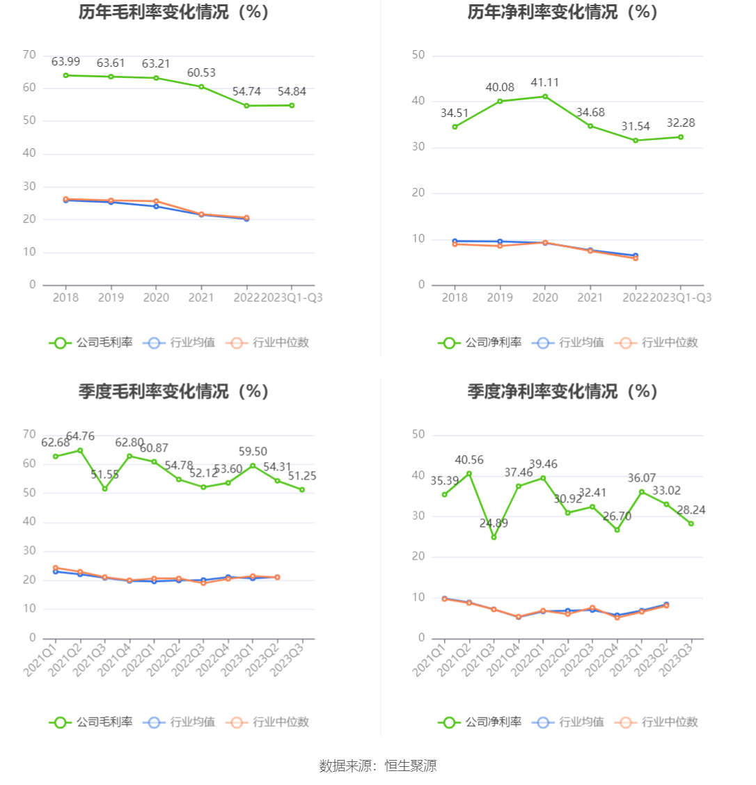 2023年前三季度,公司毛利率为54.84%,同比下降0.46个百分点;净利率为32.28%,较上年同期下降1.63个百分点。从单季度指标来看,2023年第三季度公司毛利率为51.25%,同比下降0.87个百分点,环比下降3.06个百分点;净利率为28.24%,较上年同期下降4.17个百分点,较上一季度下降4.78个百分点。