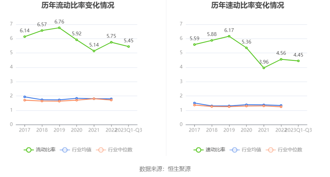 2023年前三季度,公司流动比率为5.45,速动比率为4.45。