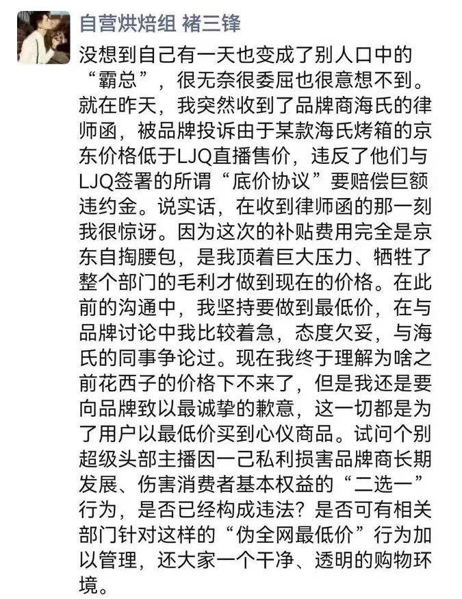 10月24日,“京东采销喊话李佳琦”冲上微博热搜。据媒体报道,京东采销人员在朋友圈公开喊话李佳琦“二选一”。该工作人员表示,京东收到了品牌海氏的律师函,被投诉某款烤箱价格低于李佳琦直播间售价,违反李佳琦直播间要求品牌签署的底价协议,并要求赔偿巨额违约金。