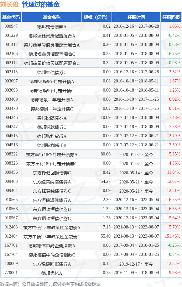 刘长俊先生:硕士,固定收益研究部副总经理,上海财经大学金融学硕士。曾任上海新世纪资信评估投资服务有限公司债项评级部分析师、上海大智慧股份有限公司宏观行业部研究员、国金证券股份有限公司经纪业务部客户经理,平安银行股份有限公司投资经理、德邦基金管理有限责任公司固定收益研究员、基金经理。2015年6月加入德邦基金,现任公司投资研究部基金经理,目前担任德邦优化灵活配置混合型证券投资基金、德邦德焕9个月定期开放债券型证券投资基金、德邦德景一年定期开放债券型证券投资基金、德邦纯债债券型证券投资基金和德邦锐乾债券型证券投资基金的基金经理。2019年7月加盟东方基金管理有限责任公司,2019年12月17日任东方稳健回报债券型证券投资基金基金经理。2020年1月2日任东方卓行18个月定期开放债券型证券投资基金基金经理。2020年5月21日起担任东方臻慧纯债债券型证券投资基金基金经理。2020年12月16日至2023年05月04日起担任东方恒瑞短债债券型证券投资基金基金经理。曾任东方中债1-5年政策性金融债指数证券投资基金基金经理。