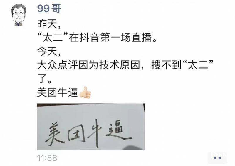 据悉,词条“屏蔽”事件发生之前,太二酸菜鱼刚刚在抖音完成了首场直播,太二方面发布的成绩显示,12小时首播gmv突破1亿元,夺得全国美食周榜第一位。管毅宏在朋友圈透露,“太二”在抖音第一场直播后,大众点评因为技术原因而搜不到“太二”。因此,外界认为这或许是美团与抖音在本地生活服务板块的竞争波及商家。