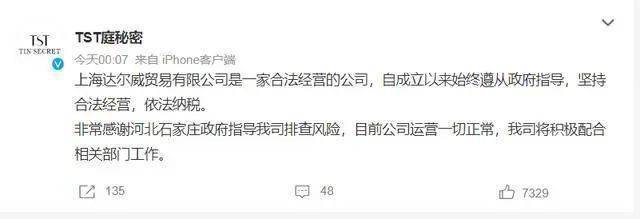 而对于“TST庭秘密”因涉嫌传销被调查一事,“TST庭秘密”曾在2021年12月29日凌晨发布微博称,上海达尔威贸易有限公司是一家合法经营的公司,自成立以来始终遵从政府指导,坚持合法经营,依法纳税。非常感谢河北石家庄政府指导我司排查风险,目前公司运营一切正常,我司将积极配合相关部门工作。