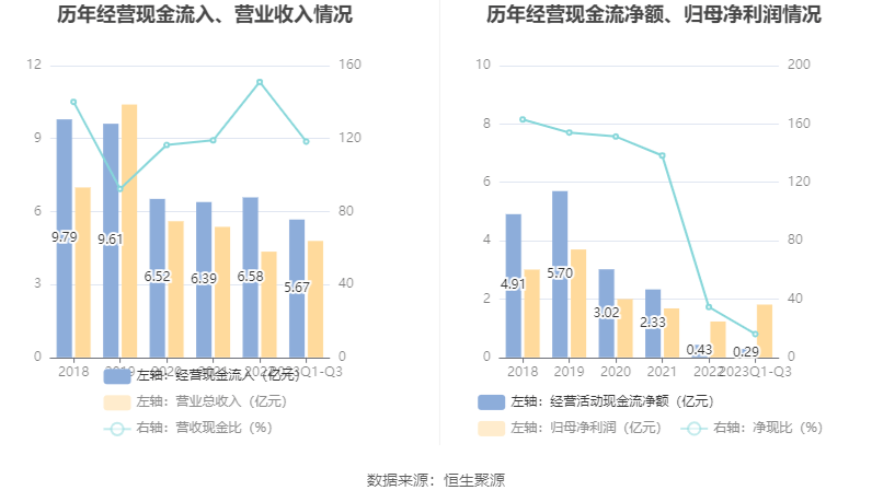 2023年前三季度,公司营业收入现金比为118.36%,净现比为16.03%。
