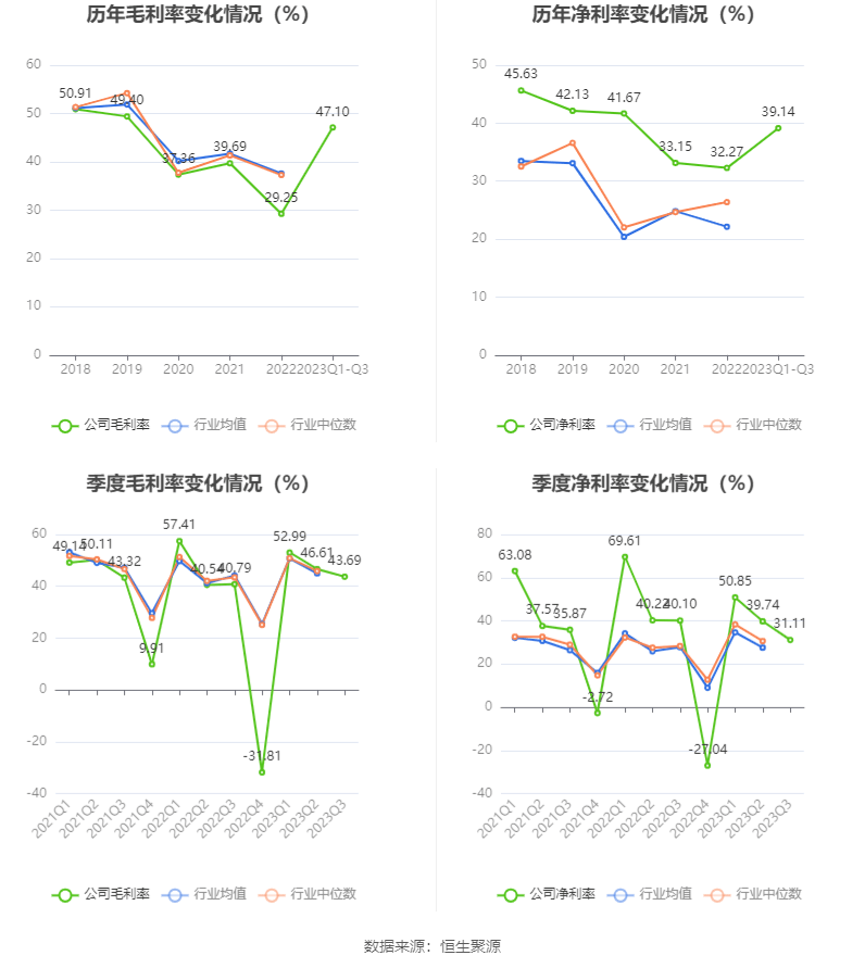 2023年前三季度,公司毛利率为47.10%,同比上升2.32个百分点;净利率为39.14%,较上年同期下降8.22个百分点。从单季度指标来看,2023年第三季度公司毛利率为43.69%,同比上升2.90个百分点,环比下降2.92个百分点;净利率为31.11%,较上年同期下降8.99个百分点,较上一季度下降8.63个百分点。