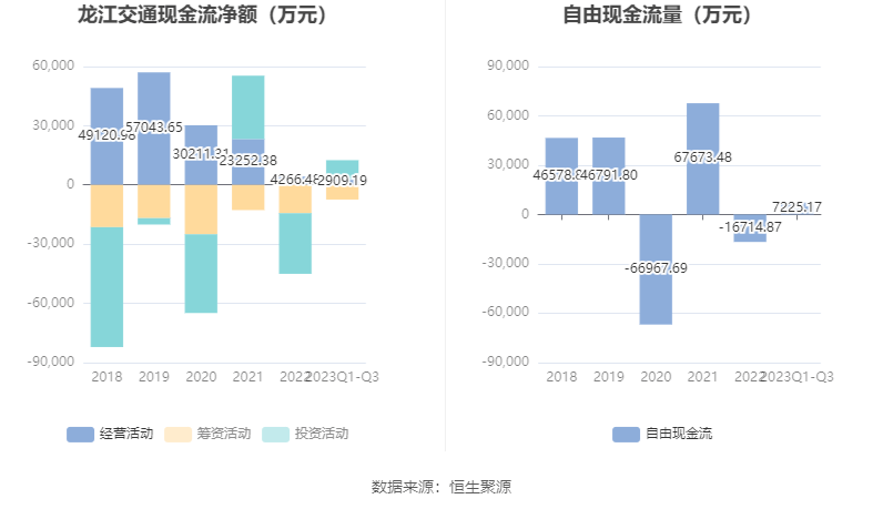 2023年前三季度,公司经营活动现金流净额为2909.19万元,同比下降68.43%,主要系子公司龙翼投资年初开始囤货,经营活动现金流出增幅大于流入增幅所致;筹资活动现金流净额-7441.18万元,同比增加5207.51万元;投资活动现金流净额9614.01万元,上年同期为-2.79亿元。