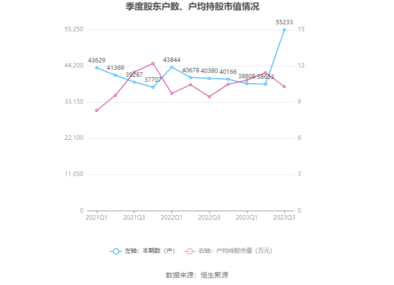 筹码集中度方面,截至2023年三季度末,公司股东总户数为5.52万户,较上半年末增长了1.66万户,增幅42.89%;户均持股市值由上半年末的11.44万元下降至10.29万元,降幅为10.05%。