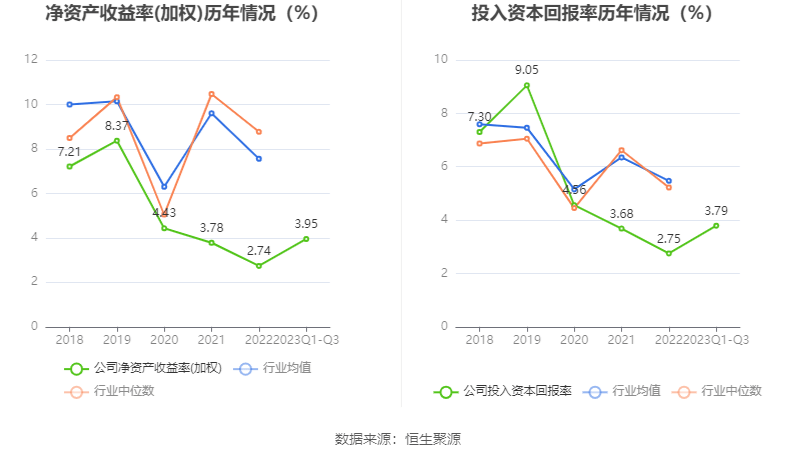 数据显示,2023年前三季度公司加权平均净资产收益率为3.95%,较上年同期增长0.45个百分点;公司2023年前三季度投入资本回报率为3.79%,较上年同期增长0.51个百分点。