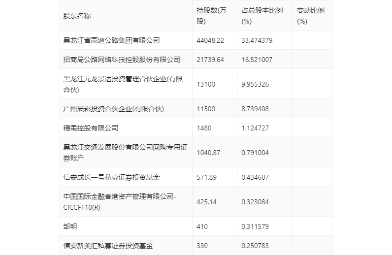 三季报显示,2023年三季度末公司十大流通股东中,新进股东为穗甬控股有限公司、黑龙江交通发展股份有限公司回购专用证券账户、中国国际金融香港资产管理有限公司-CICCFT10(R),取代了上半年末的山西证券股份有限公司约定购回式证券交易专用证券账户、广发证券股份有限公司、马琳琳。在具体持股比例上,信安成长一号私募证券投资基金、邹明、信安新美汇私募证券投资基金持股有所下降。