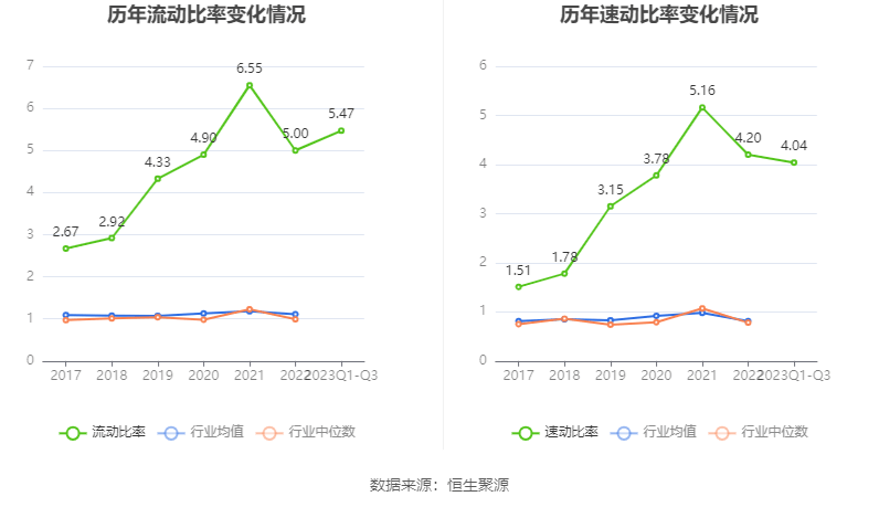 2023年前三季度,公司流动比率为5.47,速动比率为4.04。