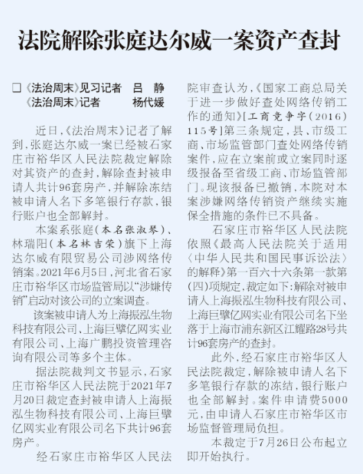 本案系张庭(本名张淑琴)、林瑞阳(本名林吉荣)旗下上海达尔威有限贸易公司涉网络传销案。2021年6月5日,河北省石家庄市裕华区市场监管局以“涉嫌传销”启动对该公司的立案调查。