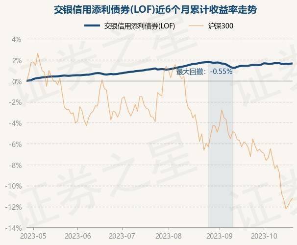 证券之星消息,10月26日,交银信用添利债券(LOF)最新单位净值为1.293元,累计净值为1.779元,较前一交易日上涨0.02%。历史数据显示该基金近1个月上涨0.15%,近3个月上涨0.56%,近6个月上涨1.67%,近1年上涨2.08%。该基金近6个月的累计收益率走势如下图: