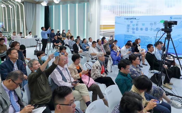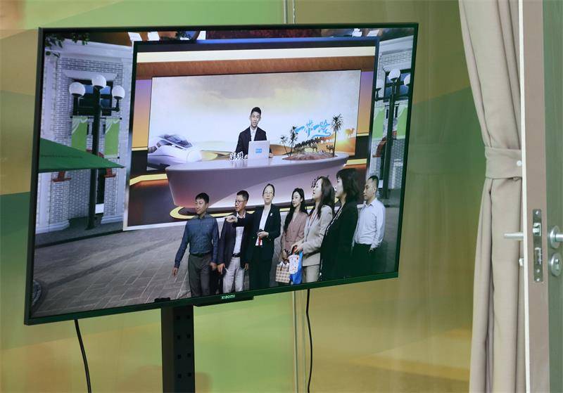 9. 讲座结束后,嘉宾和主持人参观上报集团二楼虚拟演播室,图为嘉宾们置身于不断转换的虚拟背景里,感受成立十周年的上报集团的融媒探索新成果