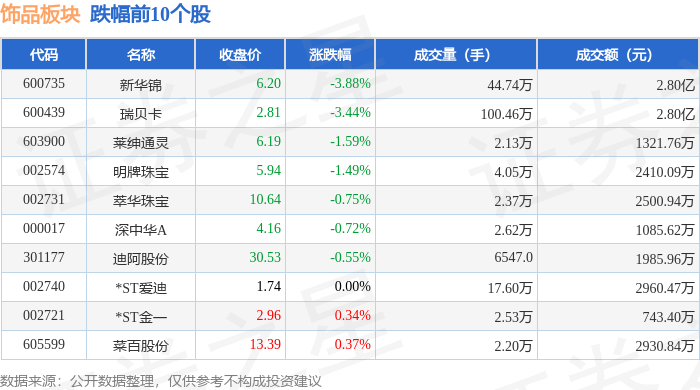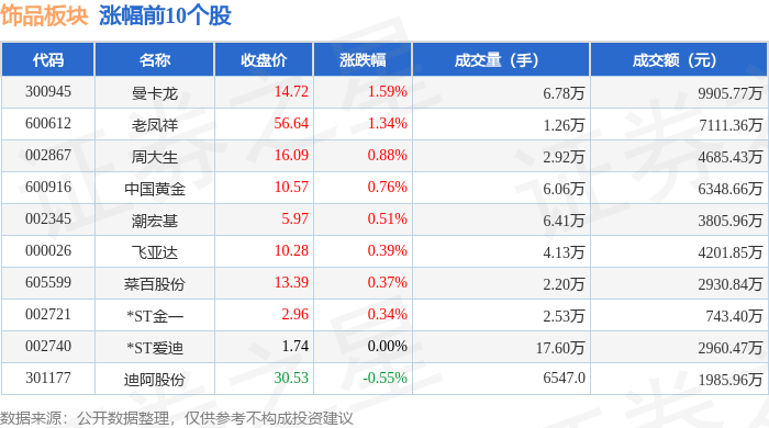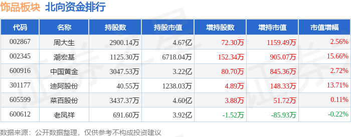 北向资金方面,当日饰品板块北向资金持股市值为17.2亿元,增持0.3亿元。其中增持最多的是周大生,增持了0.12亿元。减持持最多的是老凤祥,减持了85.93万元。饰品板块北向资金持股变动明细见下表: