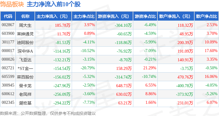 从资金流向上来看,当日饰品板块主力资金净流出1.06亿元,游资资金净流入2569.33万元,散户资金净流入8018.48万元。饰品板块个股资金流向见下表: