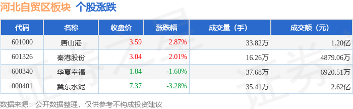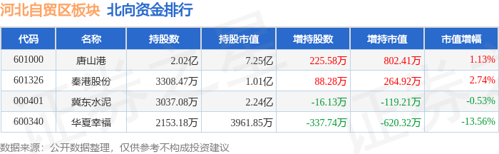 北向资金方面,当日河北自贸区板块北向资金持股市值为10.89亿元,增持327.8万元。其中增持最多的是唐山港,增持了802.41万元。减持持最多的是华夏幸福,减持了620.32万元。河北自贸区板块北向资金持股变动明细见下表: