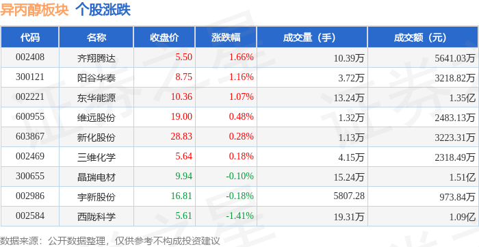 证券之星消息,10月26日异丙醇板块较上一交易日上涨0.7%,齐翔腾达领涨。当日上证指数报收于2988.3,上涨0.48%。深证成指报收于9566.1,上涨0.4%。异丙醇板块个股涨跌见下表: