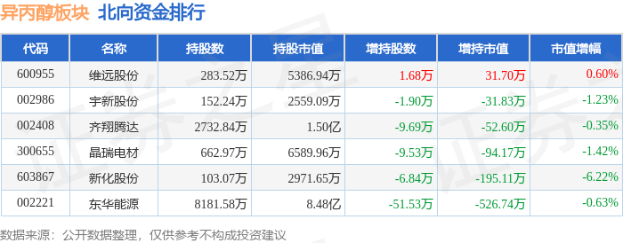 北向资金方面,当日异丙醇板块北向资金持股市值为11.73亿元,减持868.75万元。其中增持最多的是维远股份,增持了31.7万元。减持持最多的是东华能源,减持了526.74万元。异丙醇板块北向资金持股变动明细见下表: