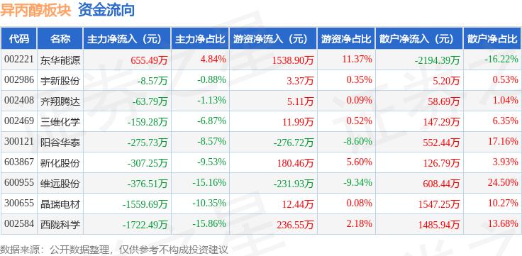 从资金流向上来看,当日异丙醇板块主力资金净流出3817.81万元,游资资金净流入1480.16万元,散户资金净流入2337.64万元。异丙醇板块个股资金流向见下表: