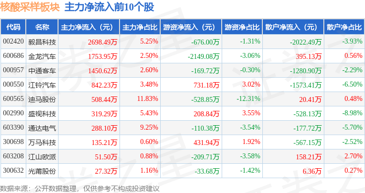 从资金流向上来看,当日核酸采样板块主力资金净流出9062.46万元,游资资金净流出5099.33万元,散户资金净流入1.42亿元。核酸采样板块个股资金流向见下表: