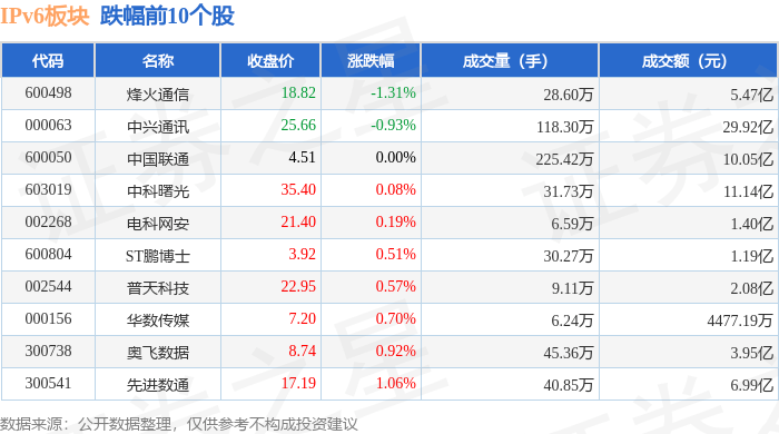 北向资金方面,当日IPv6板块北向资金持股市值为129.14亿元,增持955.34万元。其中增持最多的是烽火通信,增持了0.31亿元。减持持最多的是剑桥科技,减持了0.5亿元。IPv6板块北向资金持股变动明细见下表: