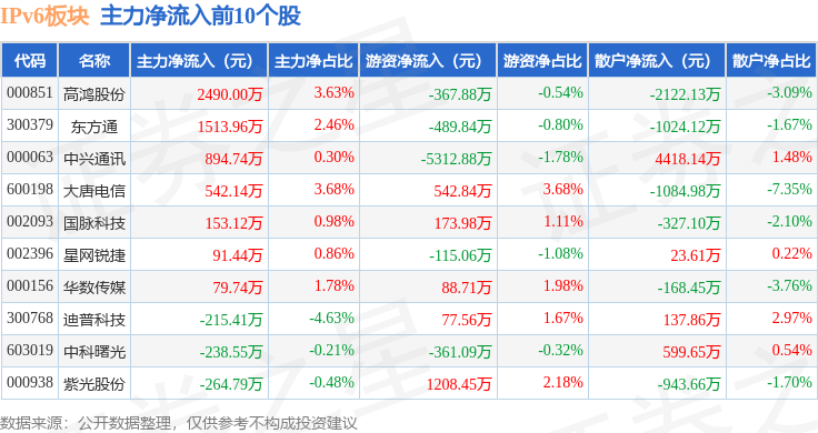 从资金流向上来看,当日IPv6板块主力资金净流出9960.92万元,游资资金净流出3469.95万元,散户资金净流入1.34亿元。IPv6板块个股资金流向见下表: