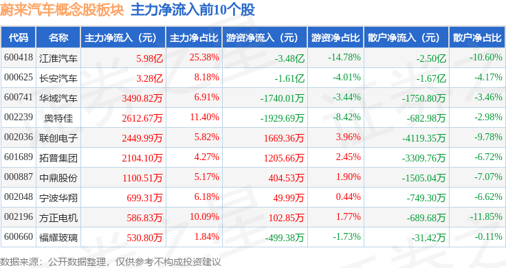 从资金流向上来看,当日蔚来汽车概念股板块主力资金净流入1.26亿元,游资资金净流出2.44亿元,散户资金净流入1.18亿元。蔚来汽车概念股板块个股资金流向见下表: