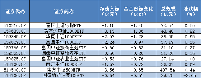 富国上证综指ETF,份额减少1.45亿份,净流出额1.15亿元;