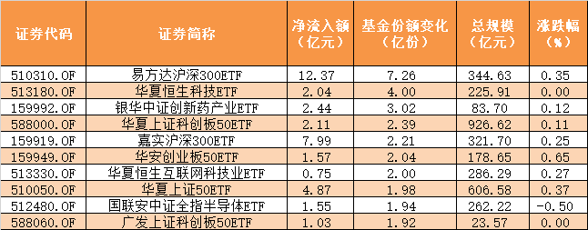 易方达沪深300ETF,份额增加了7.26亿份,净流入额达12.37亿元,为当日最多;