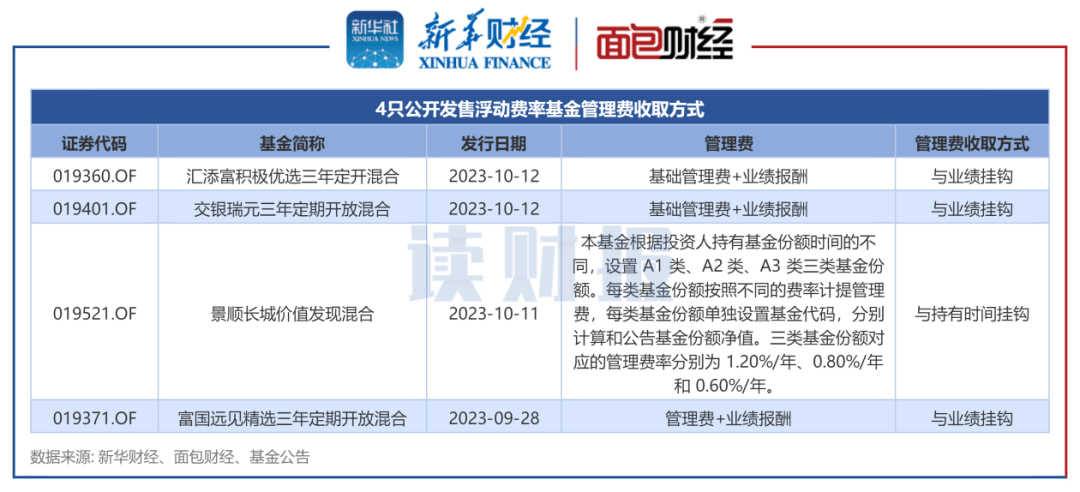 根据新华财经和面包财经研究员的不完全统计,9月以来,已有4只浮动费率基金公开发售,来自于汇添富基金、交银施罗德基金、景顺长城基金、富国基金等机构。这些基金的管理费收取大多与业绩或持有时间挂钩。