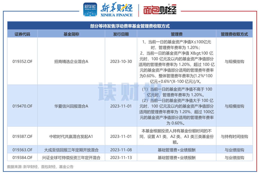 此外,目前还有多只浮动费率基金正在等待发售。这些产品中,部分根据基金总规模设置阶梯式管理费率,包括招商精选企业混合、华夏信兴回报混合等。