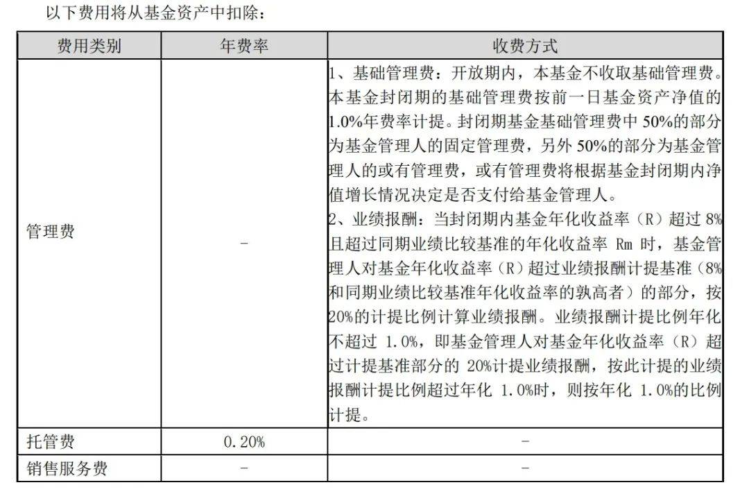 业绩报酬部分,当封闭期内基金年化收益率(R)超过8%且超过同期业绩比较基准的年化收益率Rm时,基金管理人对基金年化收益率(R)超过业绩报酬计提基准(8%和同期业绩比较基准年化收益率的孰高者)的部分,按20%的计提比例计算业绩报酬。业绩报酬计提比例年化不超过1.0%。