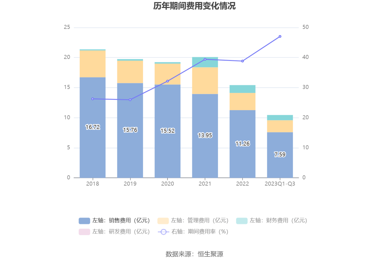 2023年前三季度,公司期间费用为10.46亿元,较上年同期减少1.42亿元;但期间费用率为47.02%,较上年同期上升7.98个百分点。其中,销售费用同比下降14.34%,管理费用同比下降1.22%,财务费用同比下降12.11%。