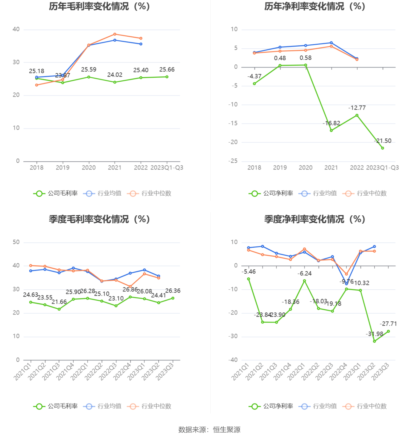 2023年前三季度,公司毛利率为25.66%,同比上升0.71个百分点;净利率为-21.50%,较上年同期下降7.80个百分点。从单季度指标来看,2023年第三季度公司毛利率为26.36%,同比上升3.26个百分点,环比上升1.95个百分点;净利率为-27.71%,较上年同期下降8.53个百分点,较上一季度上升4.27个百分点。