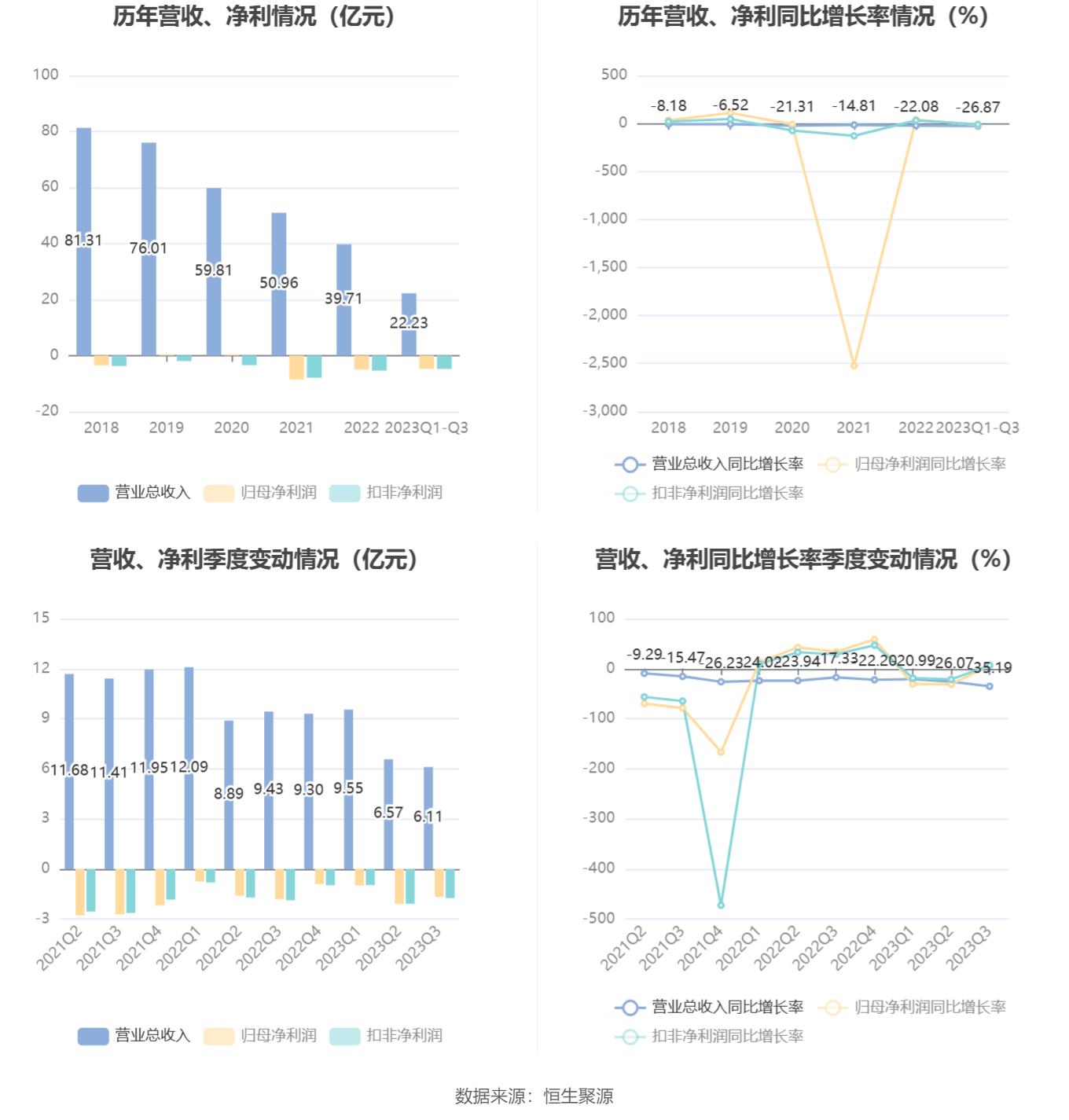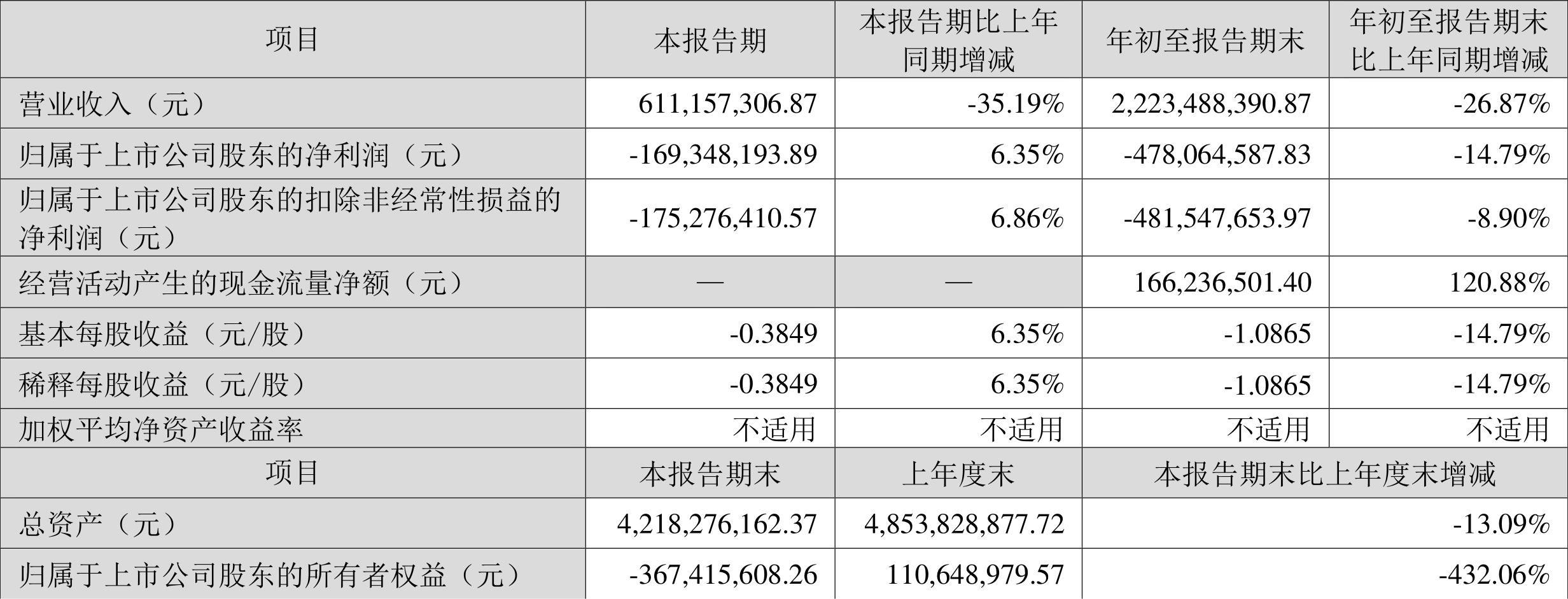 根据三季报,公司第三季度实现营业总收入6.11亿元,同比下降35.19%,环比下降6.98%;归母净利润-1.69亿元,同比增长6.35%,环比增长19.41%;扣非净利润-1.75亿元,同比增长6.86%,环比增长16.16%。