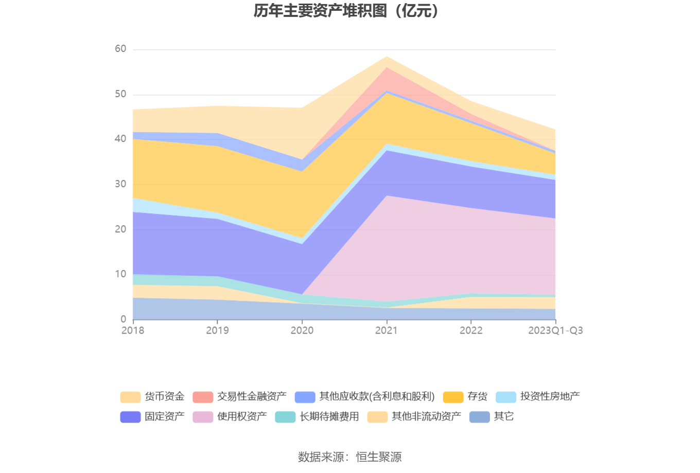 资产重大变化方面,截至2023年三季度末,公司存货较上年末减少43.78%,占公司总资产比重下降6.12个百分点;货币资金较上年末增加65.43%,占公司总资产比重上升5.31个百分点;固定资产较上年末减少7.15%,占公司总资产比重上升1.30个百分点;使用权资产较上年末减少10.43%,占公司总资产比重上升1.19个百分点。