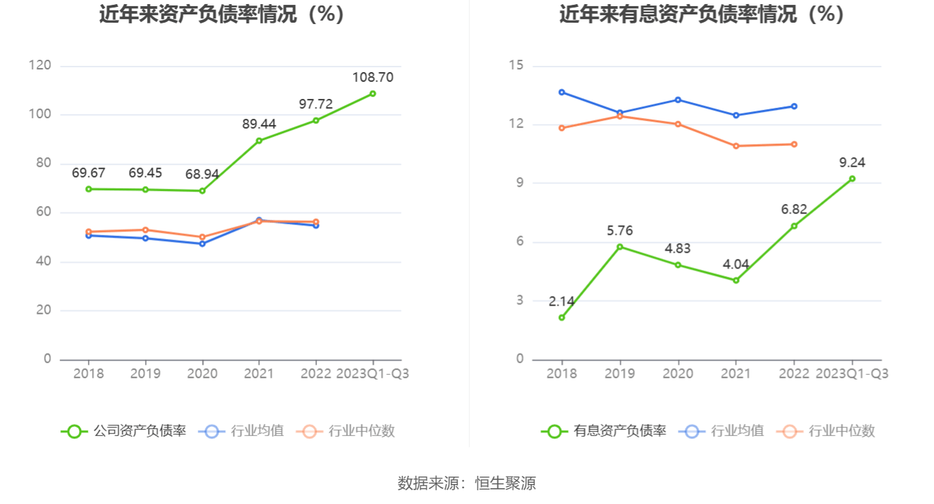 在偿债能力方面,公司2023年三季度末资产负债率为108.70%,相比上年末上升10.98个百分点;有息资产负债率为9.24%,相比上年末上升2.42个百分点。
