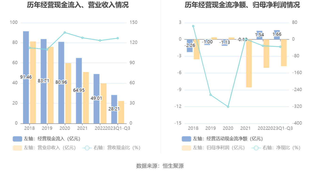 2023年前三季度,公司营业收入现金比为126.86%,净现比为-34.77%。